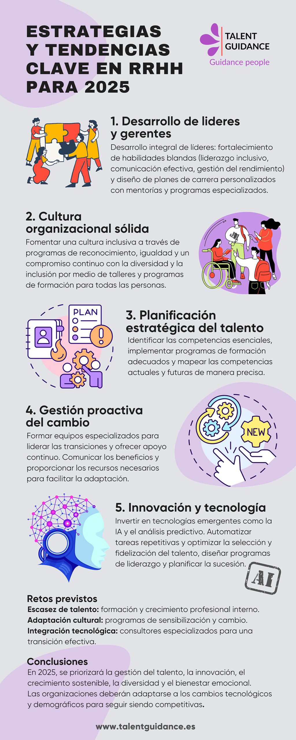 Para comprender mejor las tendencias y estrategias que están dando forma a los Recursos Humanos en 2025, a continuación, se presenta una infografía que resume los puntos clave presentados. Esta visualización no solo proporciona una rápida panorámica de las acciones necesarias para la implementación efectiva de estas estrategias, sino que también sirve como una herramienta práctica para tener presente en los procesos de toma de decisiones.