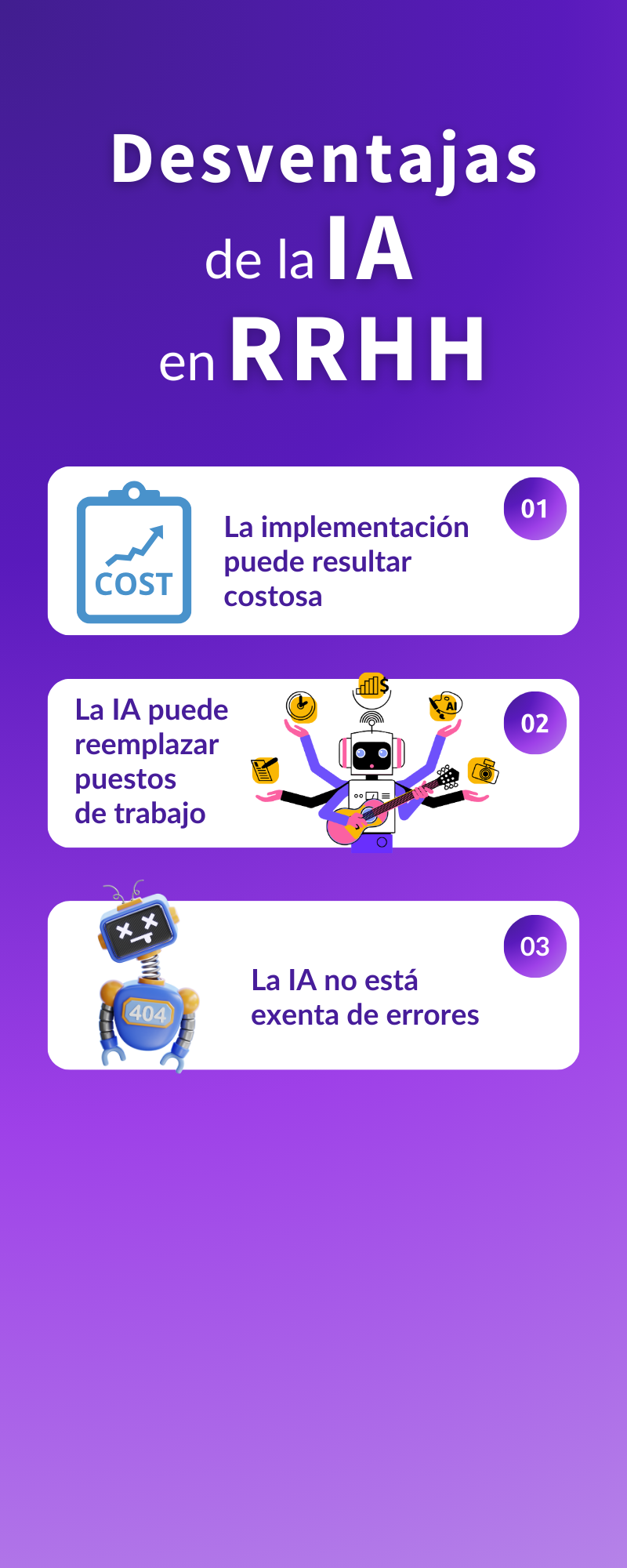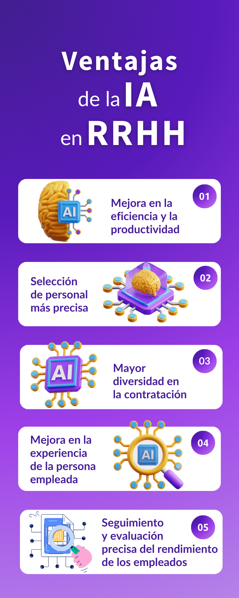 - Mejora en la experiencia de la persona empleada: al automatizar las tareas administrativas y el análisis de datos como control de horarios, permisos, vacaciones, selección de curriculums, programación de entrevistas, seguimiento de candidatos, etc. La IA nos puede brindar respuestas rápidas a consultas y mejorar la experiencia de las personas que forman la empresa.